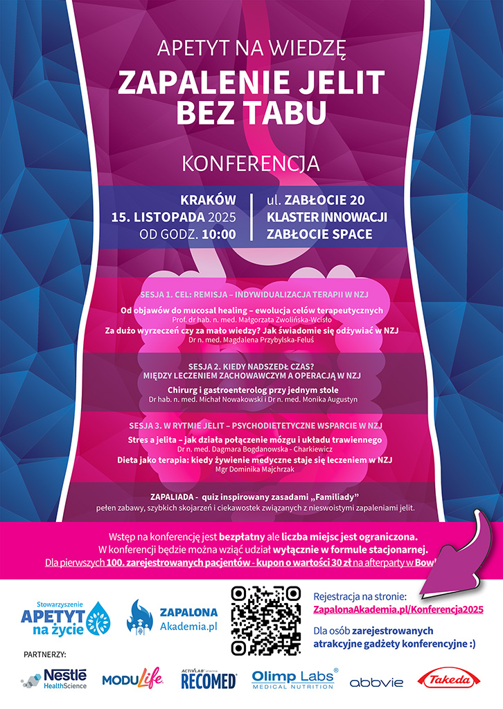 Przyjdź na konferencję „Zapalenie Jelit bez Tabu” – przygotowaliśmy porcję mocno odżywczej wiedzy, pełnej praktycznych wskazówek, które mogą zaoszczędzić zdrowia i… niejednego „kawałka” jelit.
